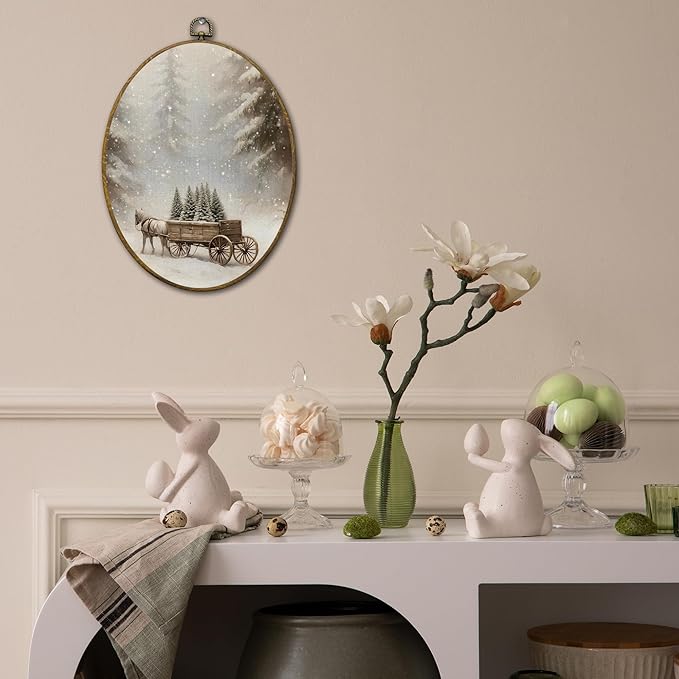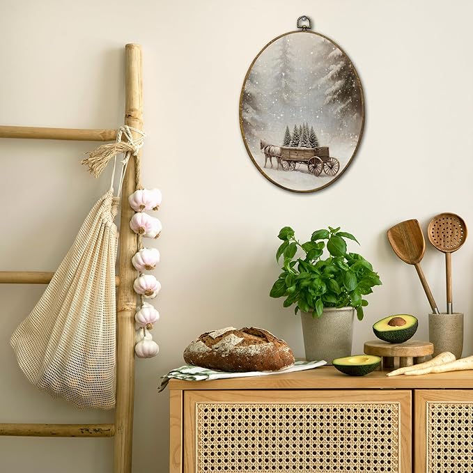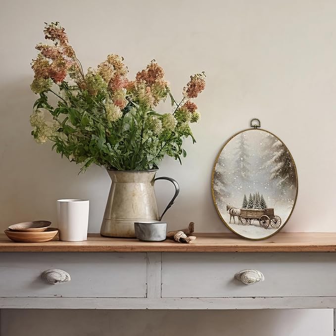 QZQE Vintage Christmas Winter Forest Oval Wall Art Decor Framed, Winter Landscape Pine Trees Carriage Oval Canvas Prints, Cozy Rustic Wall Hanging Decor for Home Bedroom Living Room, 8.6x11.4 Inch
