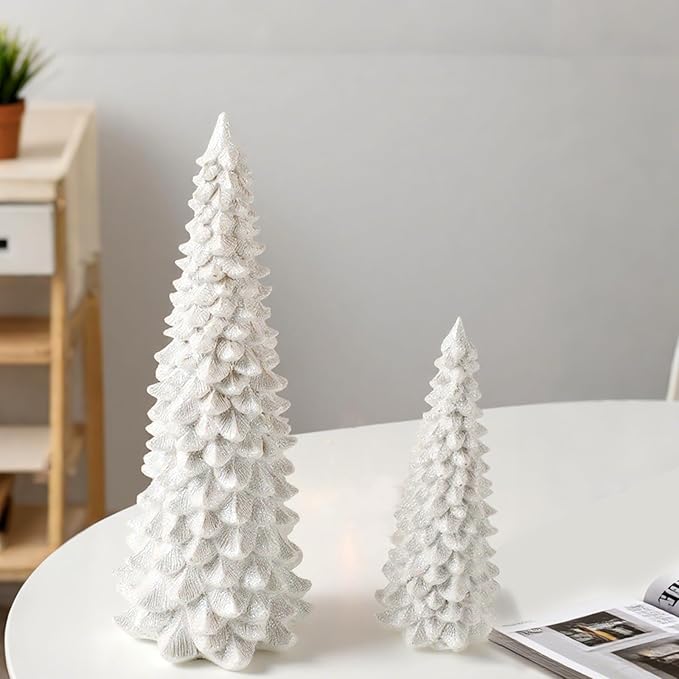 2Pcs Christmas Tree Decoration Figurines, Christmas Tree Statues Glittered Resin Desktop Mini Small Tabletop Ornaments Holiday Fireplace Home Decor Gifts (White)