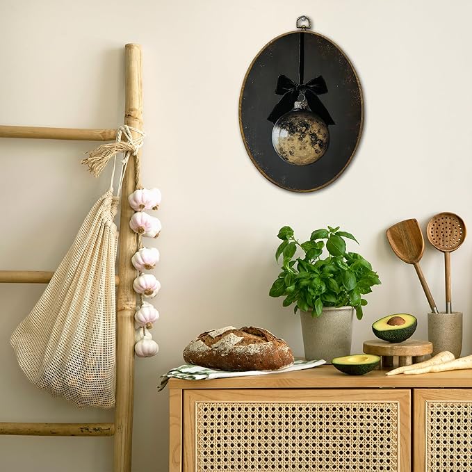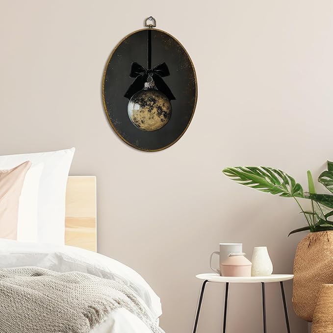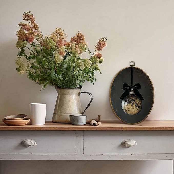 QZQE Vintage Moody Christmas Oval Wall Art Decor Framed, Dark Academia Coquette Bow Xmas Bauble Ball Oval Canvas Prints, Retro Christmas Wall Hanging Decor for Home Bedroom Living Room, 8.6x11.4 Inch