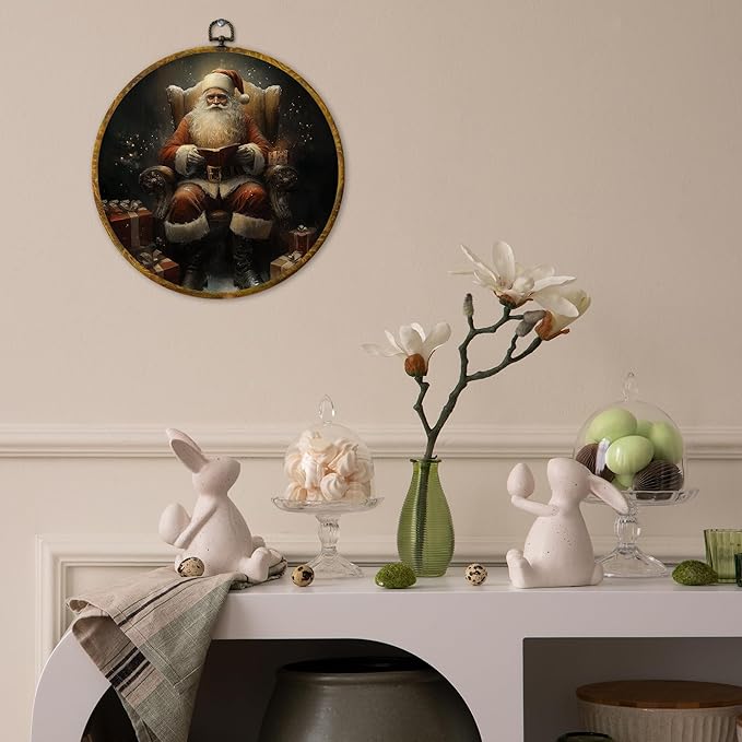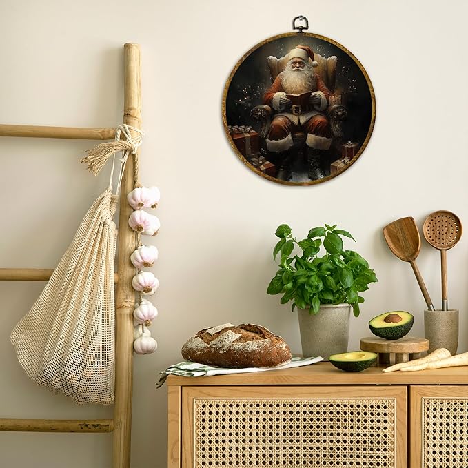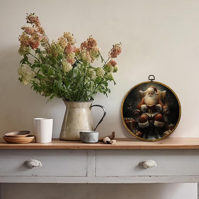 QZQE Vintage Christmas Santa Round Wall Art Decor Framed, Dark Moody Santa Reading Book Circle Canvas Prints, Rustic Xmas Circular Wall Hanging Decor for Home Library Reading Room Gallery, 10x10 Inch