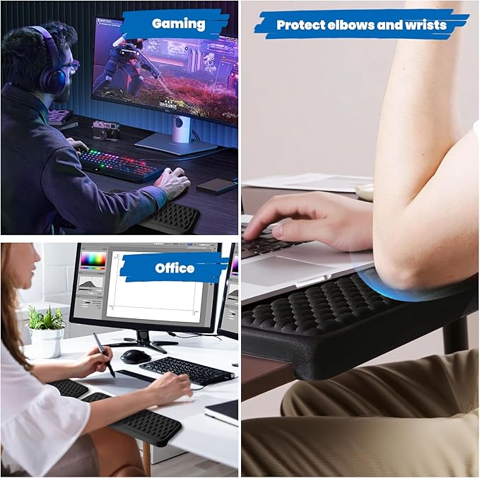- Flexible Two-Piece Set – Includes 2 adjustable elbow pads for desk, allowing custom spacing to fit straight or L-shaped desks. Optimizes arm placement to reduce fatigue during typing or gaming.