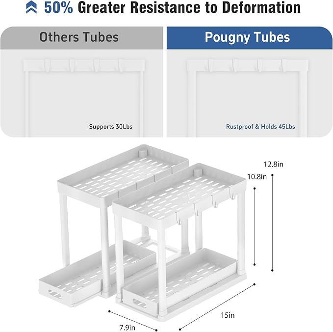 • 【2-Pack Anti-Slip Under Sink Organizers】Secure your space with 2 POUGNY cabinet organizers! Sized at 15” x 7.9” x 12.8”, our under sink storage fits perfectly around pipes, maximizing kitchen/bathroom cabinet storage without sliding.