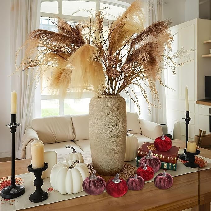- Compact Size & High Quantity: This set includes 12 versatile pieces: 8 mini foam pumpkins at 2.5" x 3" and 4 smaller ones at 2" x 2", all crafted from durable velvet and foam. The ample quantity ensures you can decorate multiple spaces – from trays to Thanksgiving party centerpieces – without clutter. Ideal for filling baskets or accenting tabletops.