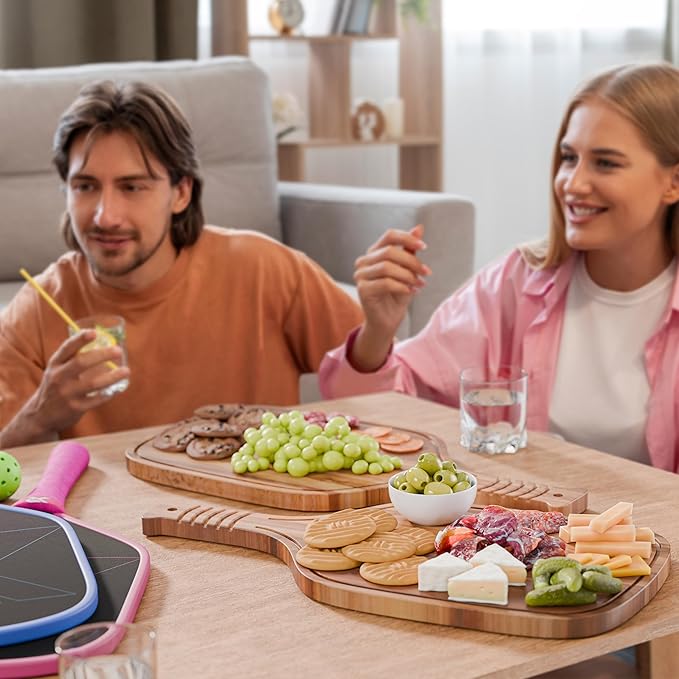- Materials & Look – Set includes 2 premium acacia wood boards, not bamboo. Each paddle-shaped board measures 16.9 x 8.1 inches and features unique natural grain. Perfect for hosting savory and sweet snacks with pickleball plates. A top-tier pickleball gift and fun pickleball swag addition.