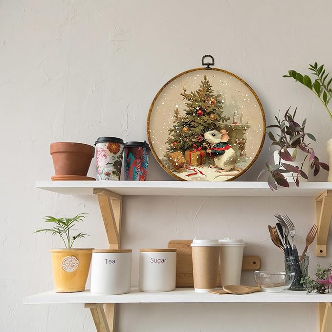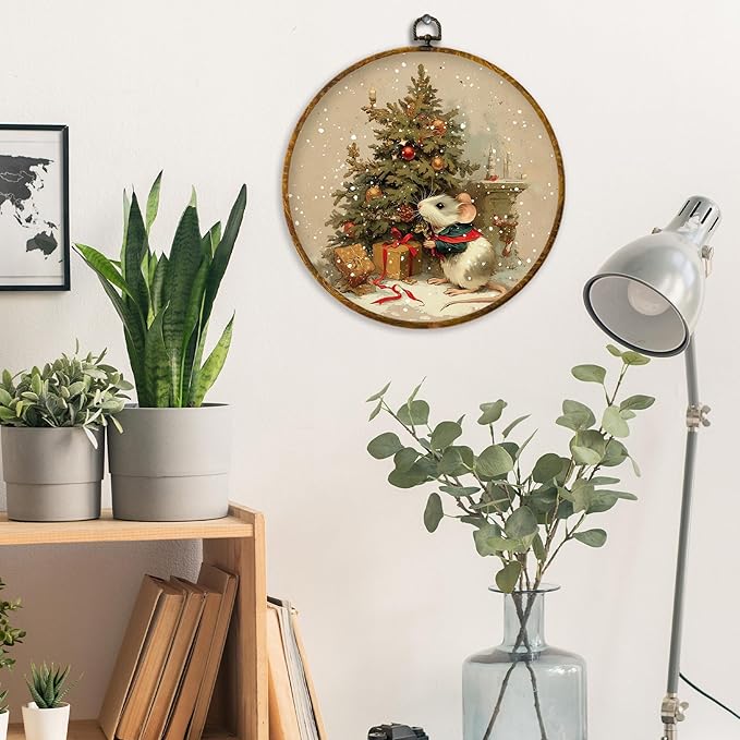 XPH Vintage Christmas Mouse Round Wall Art Framed, Retro Christmas Tree Rat Circle Wall Decor, Cozy Winter Xmas Animal Hanging Canvas Prints for Home Bedroom Living Room Decoration, 10x10 Inch