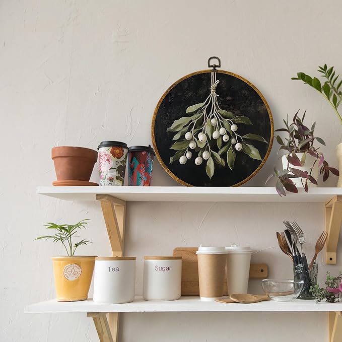 XPH Vintage Moody Christmas Round Wall Art Framed, Dark Academia Mistletoe Circle Wall Decor, Winter Cottagecore Botanical Hanging Canvas Prints for Home Bedroom Living Room Decoration, 10x10 Inch