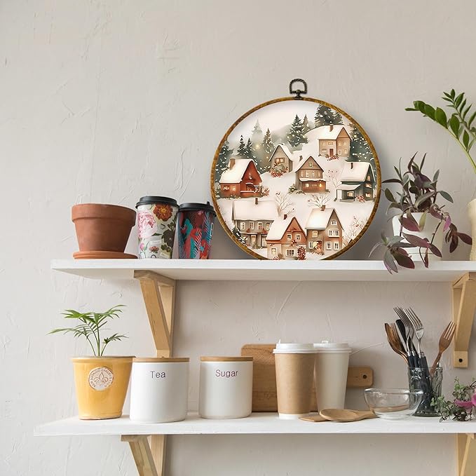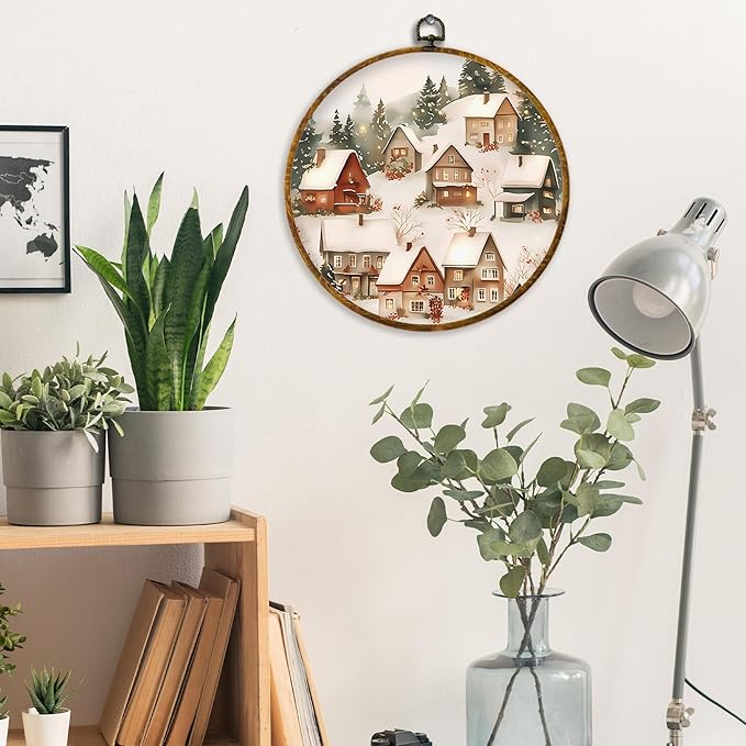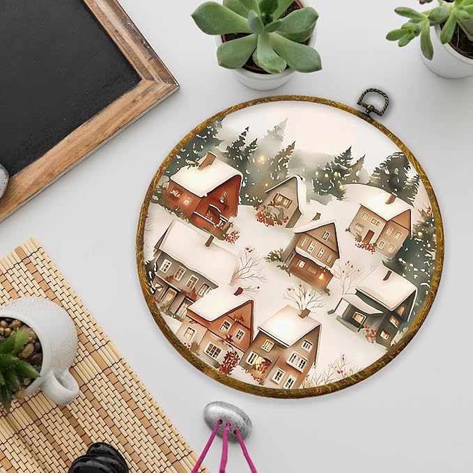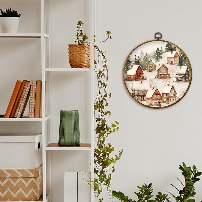 XPH Vintage Christmas Winter Village Round Wall Art Framed, Rustic Winter Snowy Circle Wall Decor, Cozy Christmas Landscape Hanging Canvas Prints for Home Bedroom Living Room Decoration, 10x10 Inch