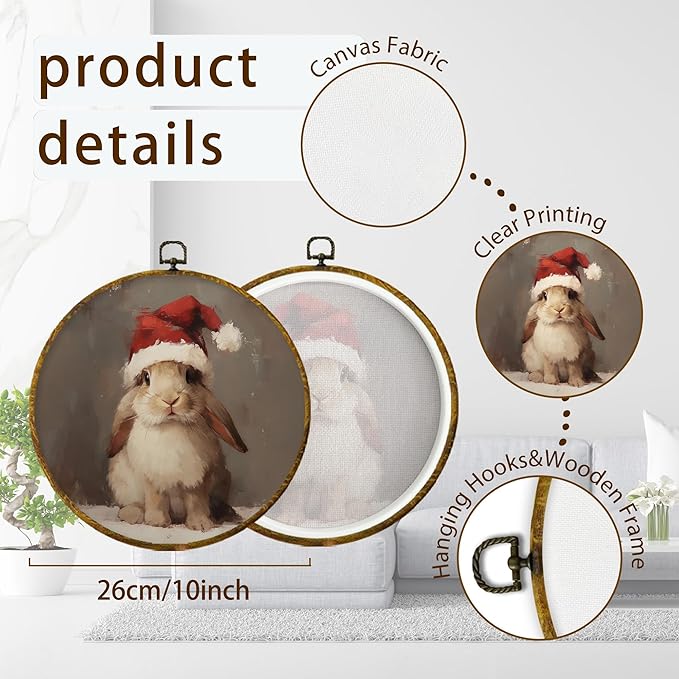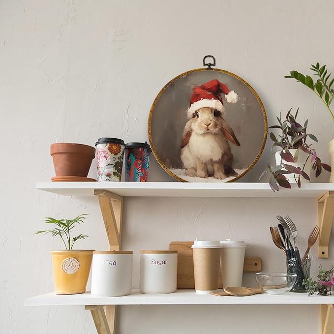 XPH Vintage Christmas Bunny Round Wall Art Framed, Rustic Christmas Rabbit Circle Wall Decor, Cottage Cozy Winter Xmas Bunny Hanging Canvas Prints for Home Bedroom Living Room Decoration, 10x10 Inch