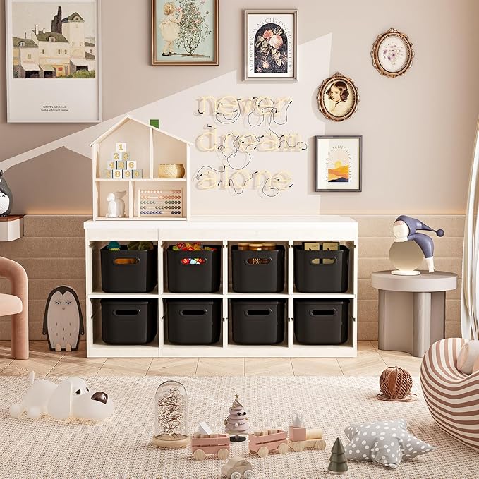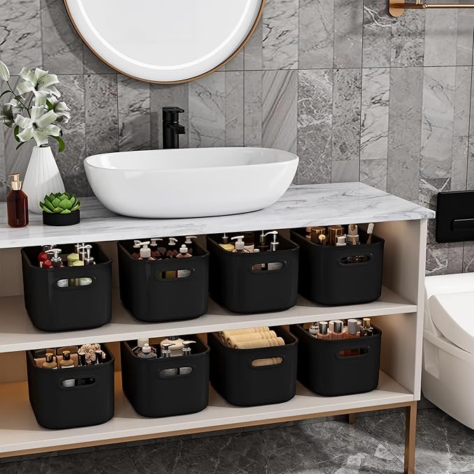 - Attractive & Decorative: Our plastic cute storage bins for organizing add a touch of elegance to your home or office, the black storage container for shelves are great for classroom crafts storage, storage food/snacks into your cabinets and pantry shelf, use in kitchen cupboards for spices, store makeup at vanity, bathroom storage under the sink, hide clutter in the pantry and they look nice on the shelf, ensuring a clutter-free and organized space.