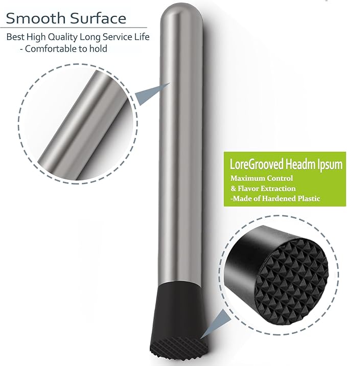 - Commercial-Grade Muddling Power: Diamond-textured muddler base crushes ice/mint/lemon wedges 40% faster than wood. Extra-long 9.8" handle ensures leverage for frozen margaritas and Caipiroska. Combines with ice tongs for seamless cocktail workflow