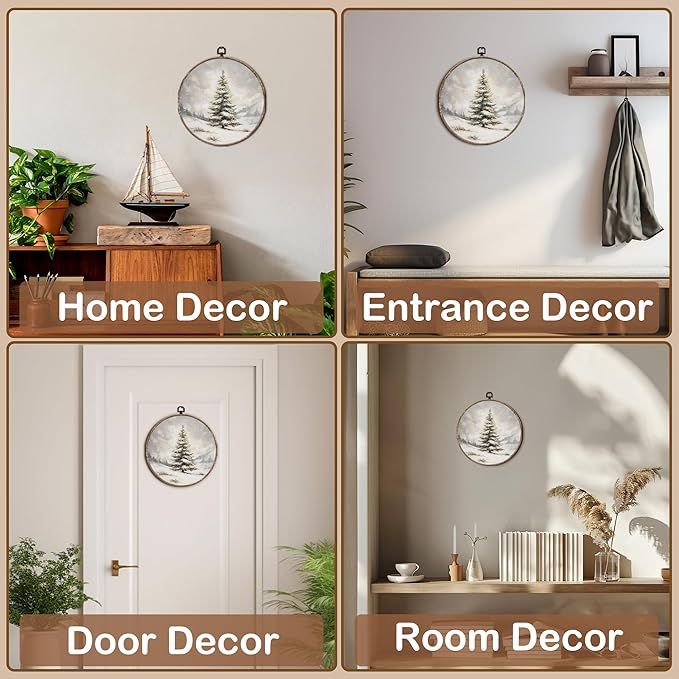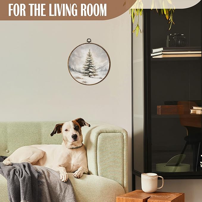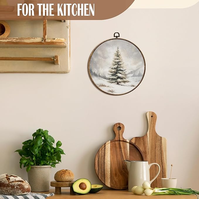 FSTCSV Winter Christmas Tree Round Wall Art Framed, Vintage Christmas Tree Snow Canvas Prints Wall Hanging Art, Retro Neutral Winter Forest Pine Trees Snow Circle Walls Decor for Home Bedroom,10x10in