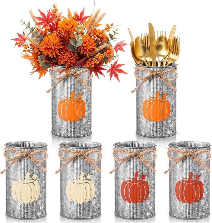 Domensi 6 Pcs Fall Table Centerpiece Pumpkin Vases Thanksgiving Decor Galvanized Metal Vases for Flowers Farmhouse Mason Jars Utensil Holder for Fall Home Thanksgiving Autumn Harvest Decorations