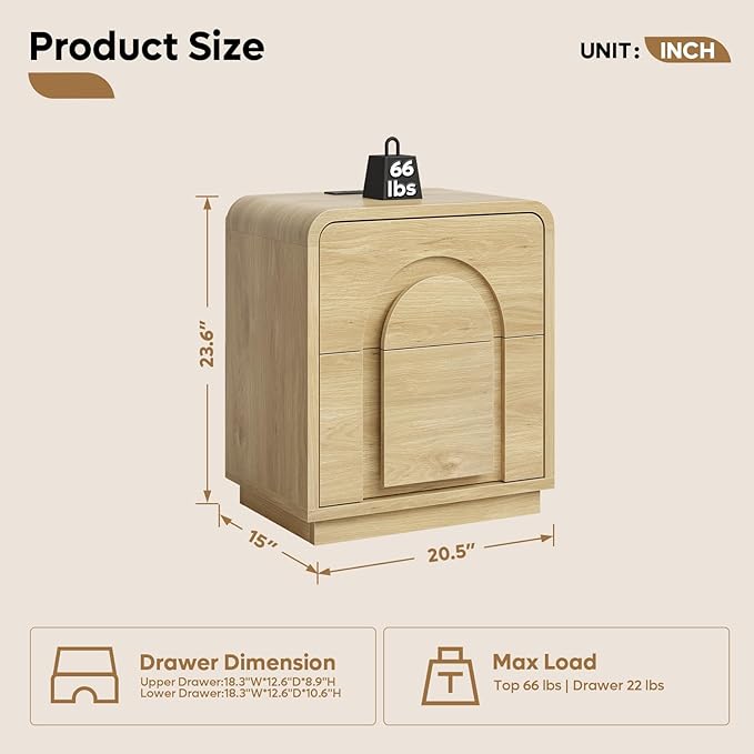 - Sturdy & Stable Construction: Crafted from thickened P2-grade engineered wood and supported by a stable pedestal base, the nightstand offers excellent durability. The tabletop holds up to 66 lbs, and each drawer supports up to 22 lbs—built to last for everyday use