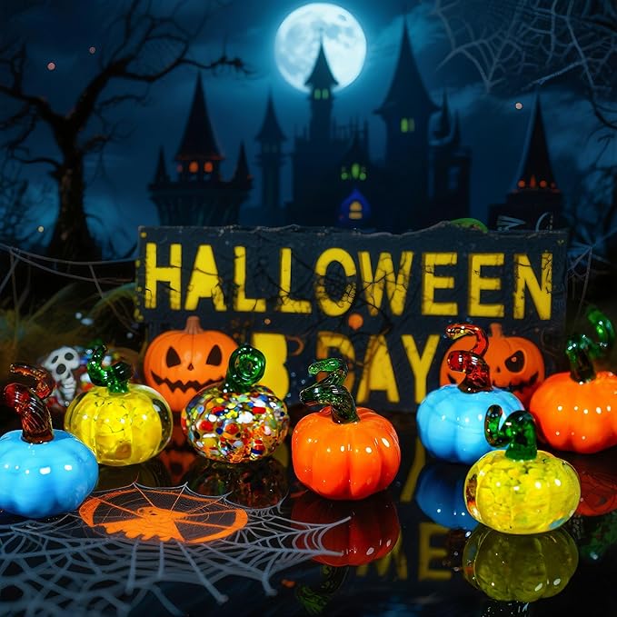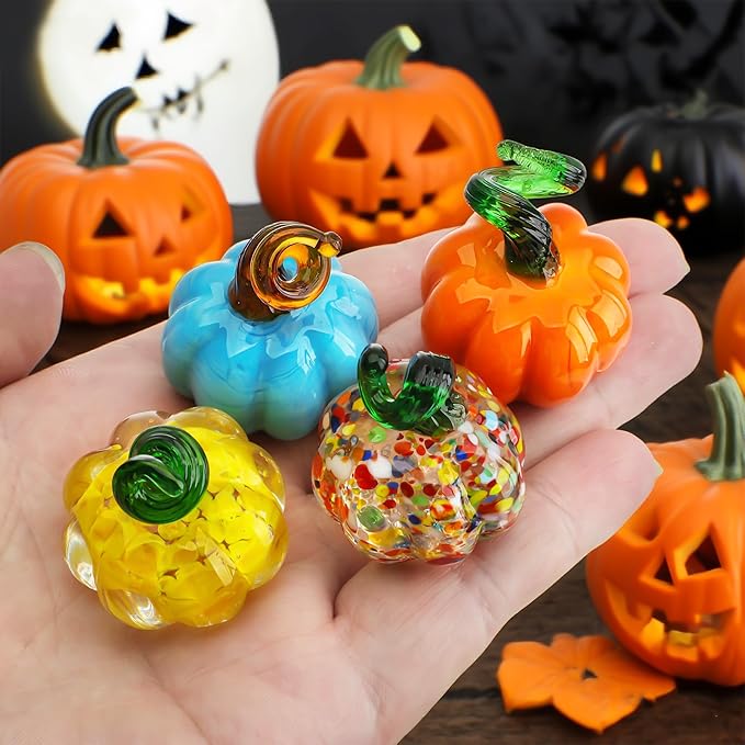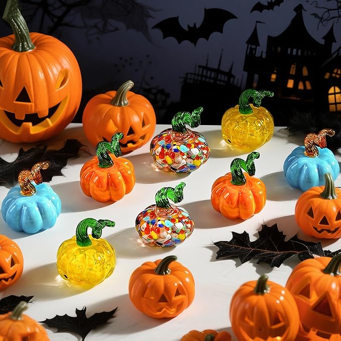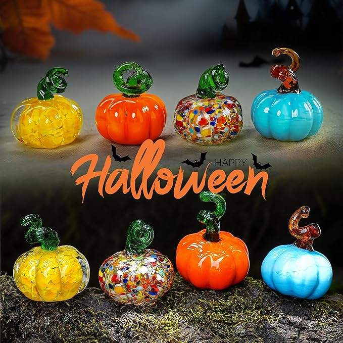 H&D HYALINE & DORA 8pcs Small Blown Glass Pumpkin Figurine Collectible Handmade Glass Halloween Pumpkin Table Art Decor for Home Thanksgiving Halloween(Colorful)