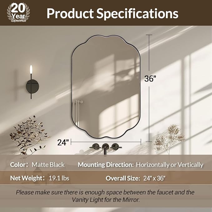 - Premium Stainless Steel Frame: Crafted from SUS304 stainless steel with a classic matte black finish, this frame resists oxidation—ideal for humid spaces like bathrooms. The sturdy 24x36-inch scalloped bathroom mirror, weighing 19.1 lbs, is designed to maintain its luster and stability for years