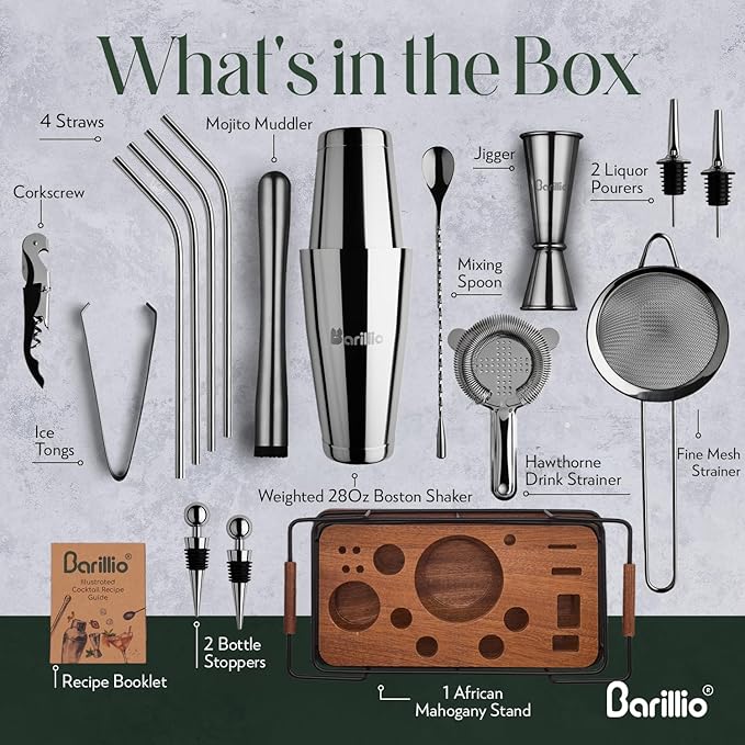 - Complete and display-worthy: 23-piece black bartender kit pairs a stainless-steel cocktail shaker set with an elegant African Mahogany stand; a tidy bar set that keeps tools upright and ready for nightly mixing and weekend parties at home.