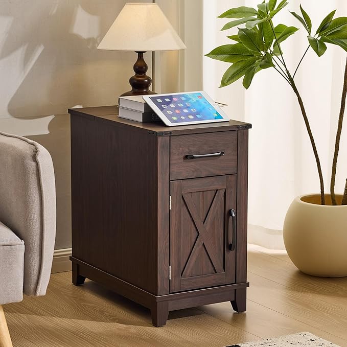 EROMMY Farmhouse End Table with Charging Station, Narrow Side Table for Living Room, Nightstand with Drawer and Storage Cabinet, Adjustable Shelf, Choco