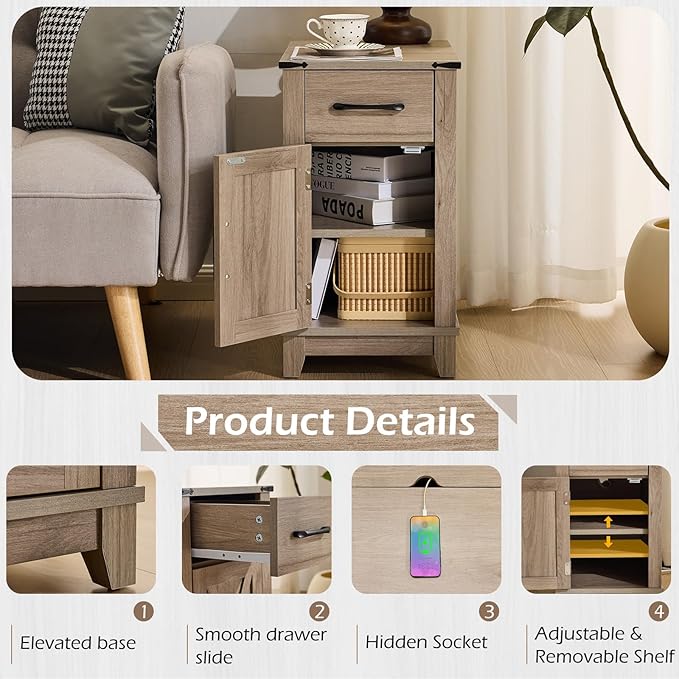 EROMMY Farmhouse End Table with Charging Station, Narrow Side Table for Living Room, Nightstand with Drawer and Storage Cabinet, Adjustable Shelf, Gray
