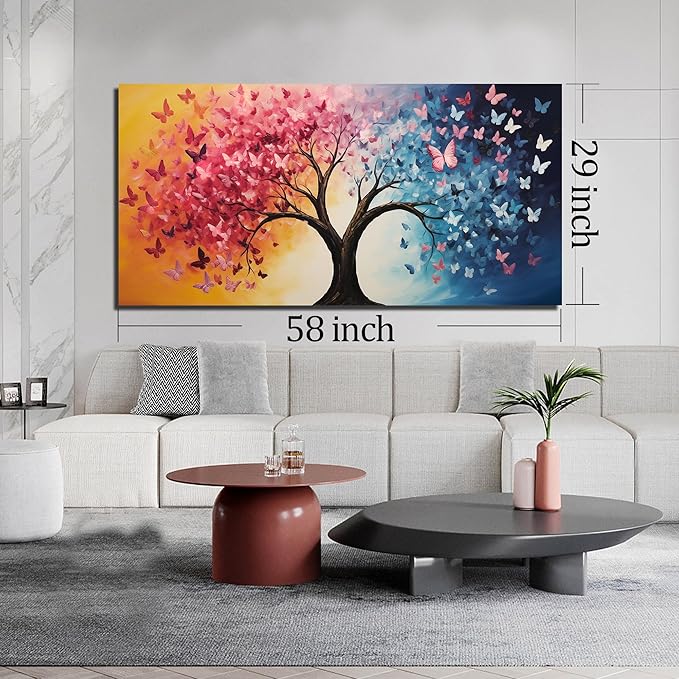GUGIKA Tree Wall Art for Living Room, Pink Gold and Blue Butterflies Canvas Wall-Decor for Bedroom, Natural Picture Print for Hallway, Large Size 59x29 Inches