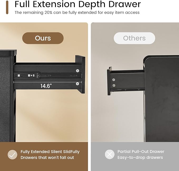 - 【Full-Extension Depth Drawers】The drawers are equipped with high-quality, three-stage soft-close drawer slides, which enable smooth operation and make it easy to insert and remove items. The slides prevent the drawers from falling, which not only reduces noise but also helps to extend the life of the drawers. Drawer 19.1" W × 14.6" D × 7.1" H.