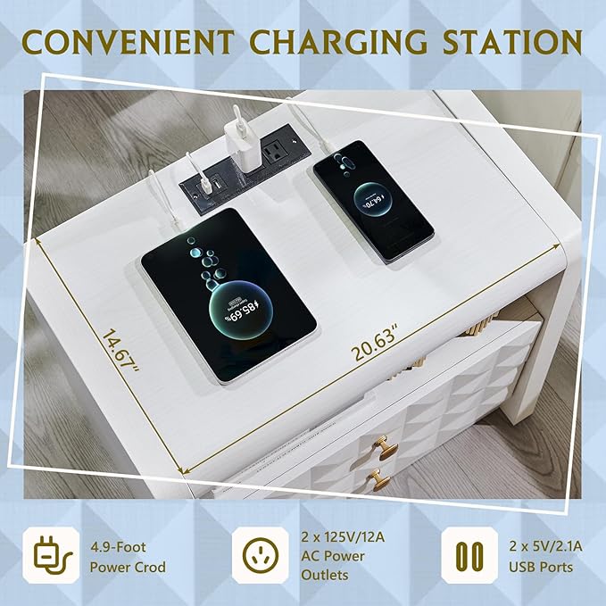 - CONVENIENT FUNCTION: The modern nightstand has a built-in charging station. It comes with 2 USB ports and 2 AC outlets to ensure that your devices are always fully charged and ready to go. A 1.97-inch diameter cable management hole on the back panel keeps your space neat and organized. Spacious desktop provides plenty of room for your essentials and favorite decorations