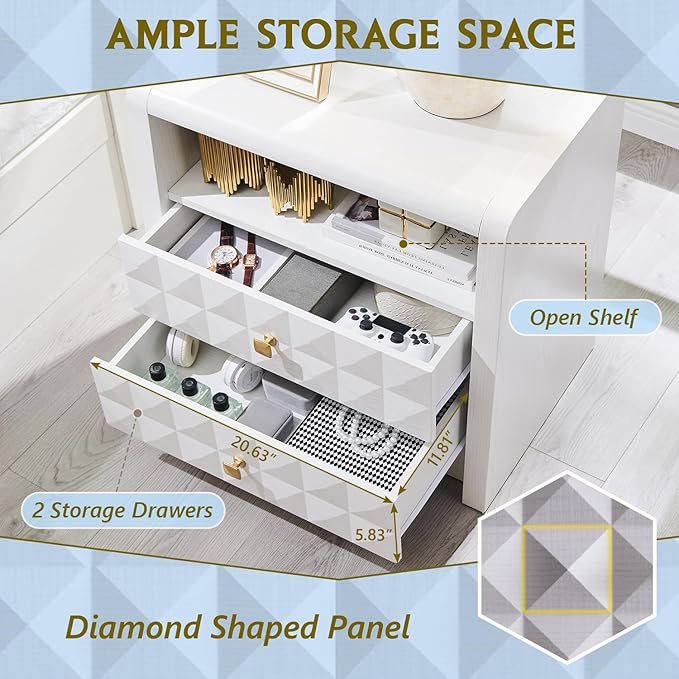 - NIGHTSTAND DIMENSIONS: 15.55"D x 23.62"W x 22.64"H, Open Shelf Dimensions: 14.57"D x 20.63"W x 6.1"H, Experience the perfect blend of elegance and practicality with the Diamond Shaped Panel Nightstand featuring two drawers and an open shelf. The drawer provides a discreet space to store your personal belongings, while the open shelf provides easy access to your favorite books and decorations. Versatile nightstand complements any home décor and ensures that your essentials are within easy reach