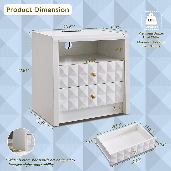- STABILITY AND DURABILITY: Made from high-quality medium-density fiberboard (MDF) and P2-grade engineered wood. The base features a widened side panel design to enhance the stability of the nightstand. The tabletop can support up to 130 pounds, and the drawers can support up to 20 pounds. High-quality coating ensures that the nightstand is easy to clean and wear-resistant, extending its service life