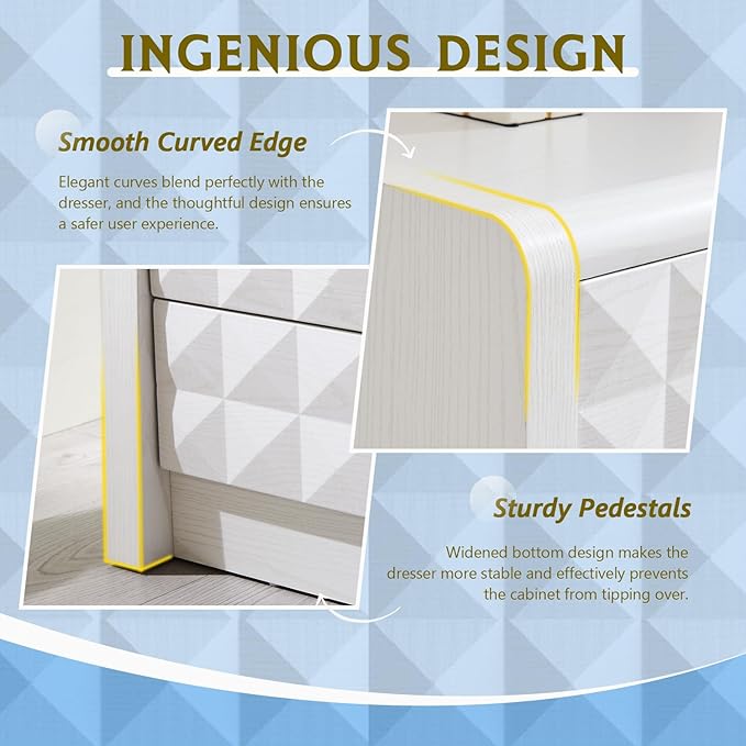 - GEOMETRIC DIAMOND-EMBOSSED NIGHTSTAND: Redefining functional aesthetics with a clean geometric design, the three-dimensional diamond-cut drawers complement the wooden panels, which are precisely joined at a 45-degree angle to create a layered play of light and shadow, enhancing visual appeal and embodying modern luxury aesthetics. Unique metal handles adorn the cabinet, adding aesthetic appeal while ensuring practicality for daily use