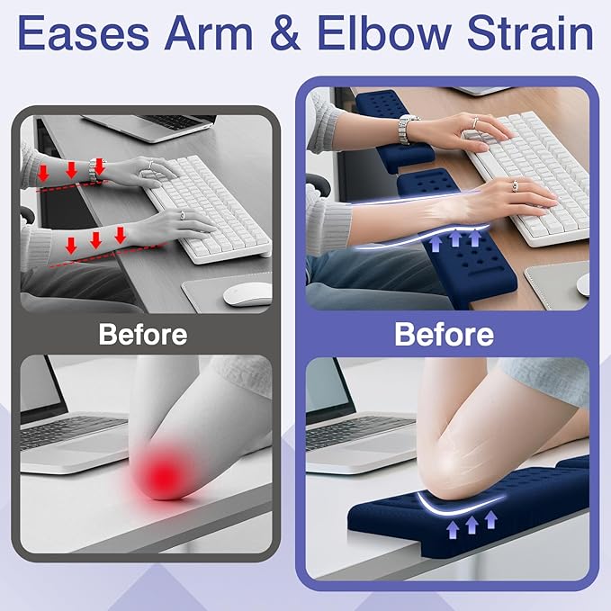 - Flexible Two-Piece Desk Arm Rest Pad – The segmented design lets you spread or bring together the elbow pads to fit any desk shape, whether straight or cornered. By adjusting the spacing, your arms and wrists stay comfortably aligned, making long hours at the desk more comfortable