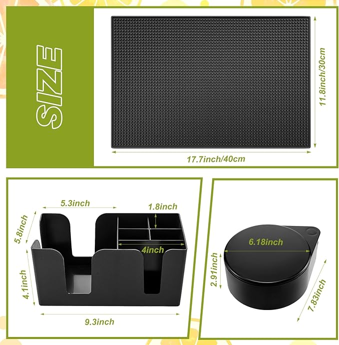 - the Perks of Having It All in One Set: our Bartender Kit is suitable for a variety of beverages and comes with a complete set, the tools will have you covered, no matter what cocktail you're going to make; In addition, The bar mat can protect your bar from scratches and spills; It is not only a spill protection mat, but also can be applied as a dish drying mat on the kitchen countertop; It comes with ice clips, ice scoops and some other accessories to facilitate the smooth mixing of drinks