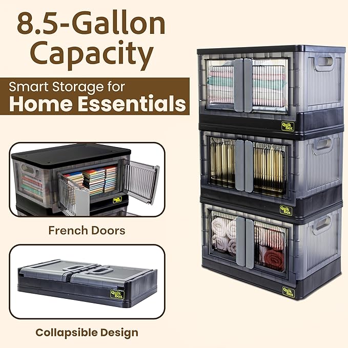 Quik Box - 8.5 Gallon 3-Pack Stackable Storage Bins with Doors & Wheels - Collapsible Organizer for Dorms, Bedroom & Home - Durable Polystyrene - Black