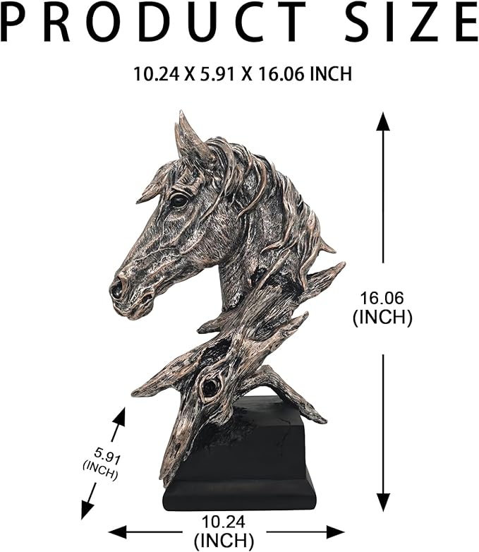 - [Majestic Retro Horse Art Sculpture] This hand drawn resin horse bust features realistic details that capture the noble spirit of a stallion. The silver-black finish and textured mane evoke the charm of vintage equestrianism, making it an eternal topic in any room.