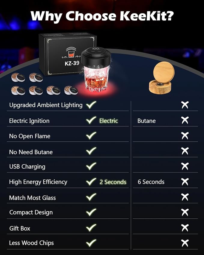 - Multi-Functional: Not just for whiskey and cocktails, this electric smoker kit elevates cheese, BBQ, dried fruits, and more! Simply place it on any glass cup, press the button for 2 seconds, and enjoy rich, aromatic smoke with minimal wood chips. A must-have tool for mixologists and foodies