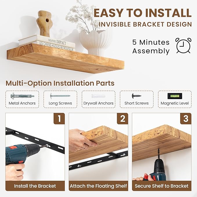 - Heavy-Duty Floating Mounting System: With a depth of 8 inches and 1.5 inches in thickness, this reclaimed elm floating shelf combines industrial-grade durability with minimalist design. The patented invisible bracket system creates a true floating effect while discreetly anchoring the shelf to support up to 50 lbs of books, decor, or kitchenware.