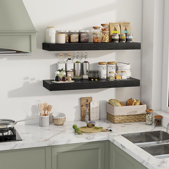 - [GENEROUS DISPLAY & STORAGE] With an expansive 12-inch depth, these floating shelves offer abundant room for books, kitchen essentials, decorative accents, and more. The extra-wide surface accommodates larger items like potted plants, baskets, or framed art, while the 2-inch thick design ensures sturdy support. Perfect for organizing and showcasing your favorite pieces without compromising on style or functionality.