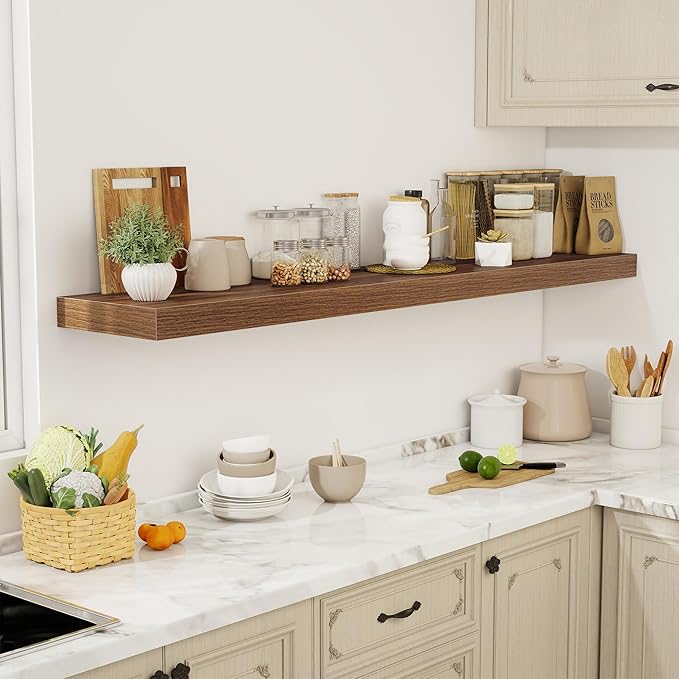 - [GENEROUS DISPLAY & STORAGE] With an expansive 12-inch depth, these floating shelves offer abundant room for books, kitchen essentials, decorative accents, and more. The extra-wide surface accommodates larger items like potted plants, baskets, or framed art, while the 2-inch thick design ensures sturdy support. Perfect for organizing and showcasing your favorite pieces without compromising on style or functionality.