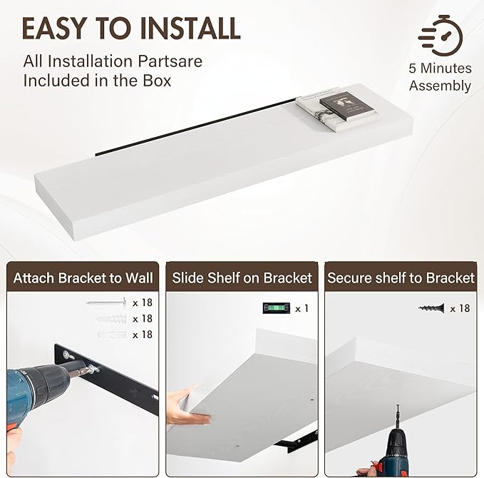 - [EFFORTLESS INSTALLATION] Each set comes with all necessary hardware and a clear, step-by-step guide for quick mounting. Transform your walls in minutes—no special tools required. Whether you're a DIY beginner or a seasoned decorator, these shelves make upgrading your space simple and hassle-free.