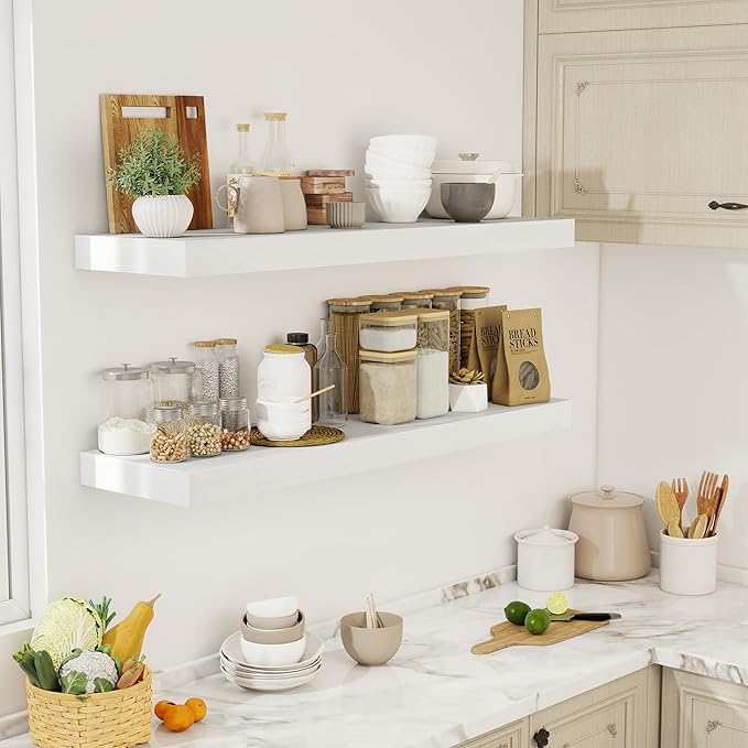 - [SPACE-SAVING WALL SOLUTION] Ideal for maximizing small rooms, kitchens, or cozy apartments, these shelves create storage without cluttering floors. Their floating design opens up living areas, making spaces feel airy and well-organized. Use them in entryways, bathrooms, or home offices to keep daily essentials neatly displayed yet within easy reach.
