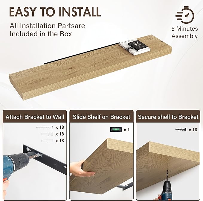 - [EFFORTLESS INSTALLATION] Each set comes with all necessary hardware and a clear, step-by-step guide for quick mounting. Transform your walls in minutes—no special tools required. Whether you're a DIY beginner or a seasoned decorator, these shelves make upgrading your space simple and hassle-free.