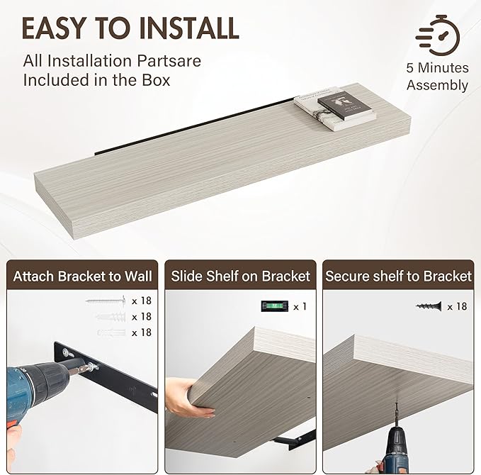 - [EFFORTLESS INSTALLATION] Each set comes with all necessary hardware and a clear, step-by-step guide for quick mounting. Transform your walls in minutes—no special tools required. Whether you're a DIY beginner or a seasoned decorator, these shelves make upgrading your space simple and hassle-free.