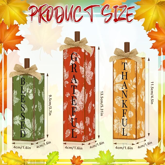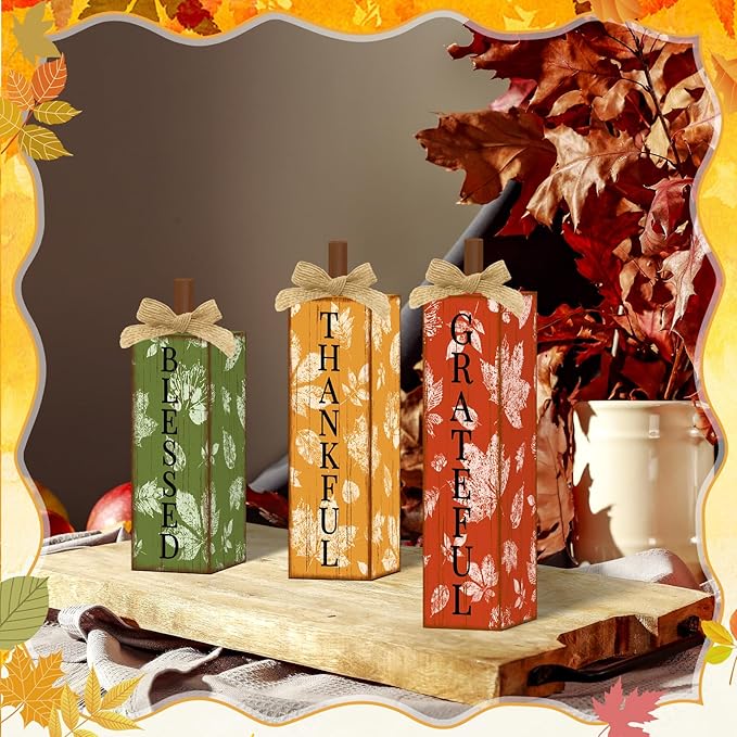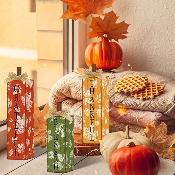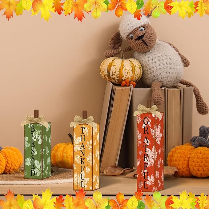 - Unique Design: This fall-themed decoration spells out ‘GRATEFUL THANKFUL BLESSED’ with vibrant wooden blocks featuring printed maple leaves in autumn tones