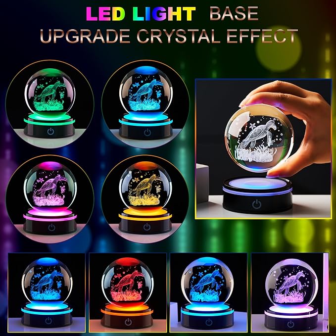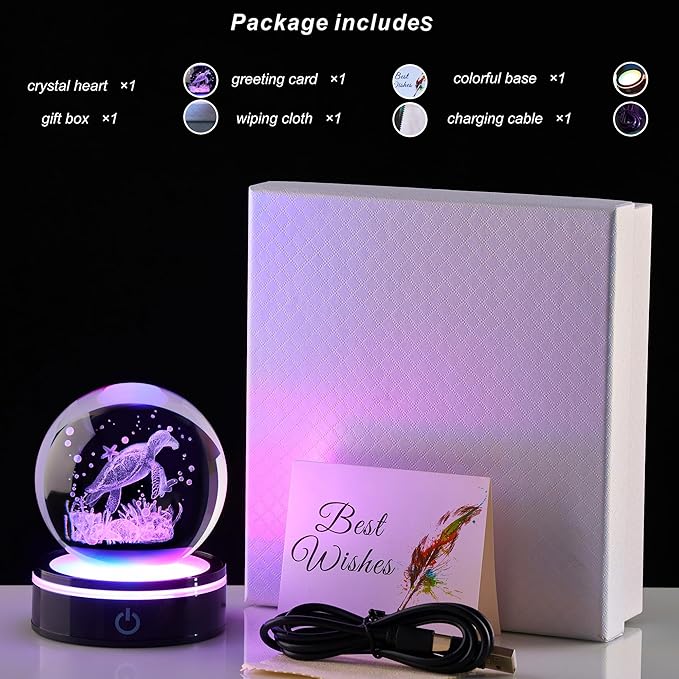 - Package & Premium Quality: Made with K9 crystal, the sea turtle figurine boasts clear, vivid, and long-lasting 3D laser engravings that won’t fade. The package includes the 3D crystal ball, a stylish gift box, a charging cable, and an LED base—everything needed for gifting or display