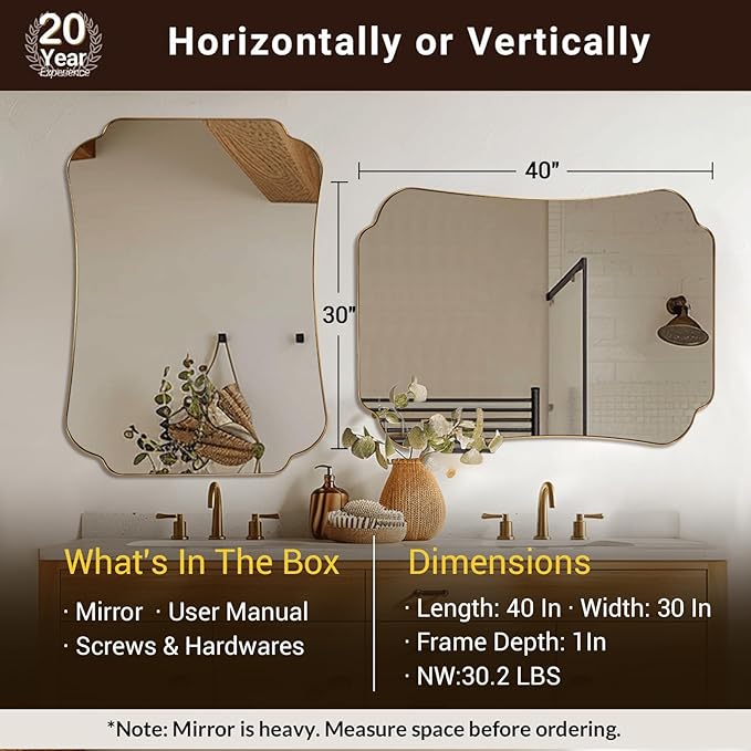 - Reliable Packaging: This modern metal framed bathroom mirror is in fully protected packing with a PE bag, poly foam, and master box to ensure it arrives in perfect condition. Sturdy 30x40-inch bathroom mirror comes with four reinforced D - ring hanging clips for quick and easy installation