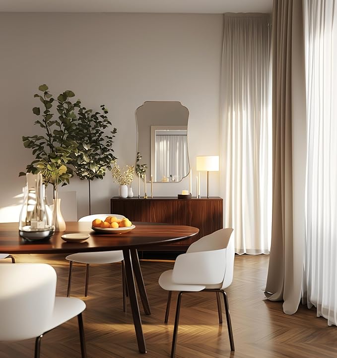 - OUTSTANDING MATERIALS: Crafted with a sturdy SUS304 frame, this symmetrical wall mirror is rustproof, durable, and built to last. Gold rectangle scalloped mirror features no-distortion HD glass with a 9mm MDF backboard for shatter-proofing and added strength. Solid and of premium quality, scalloped wall mirror is a perfect addition to your home