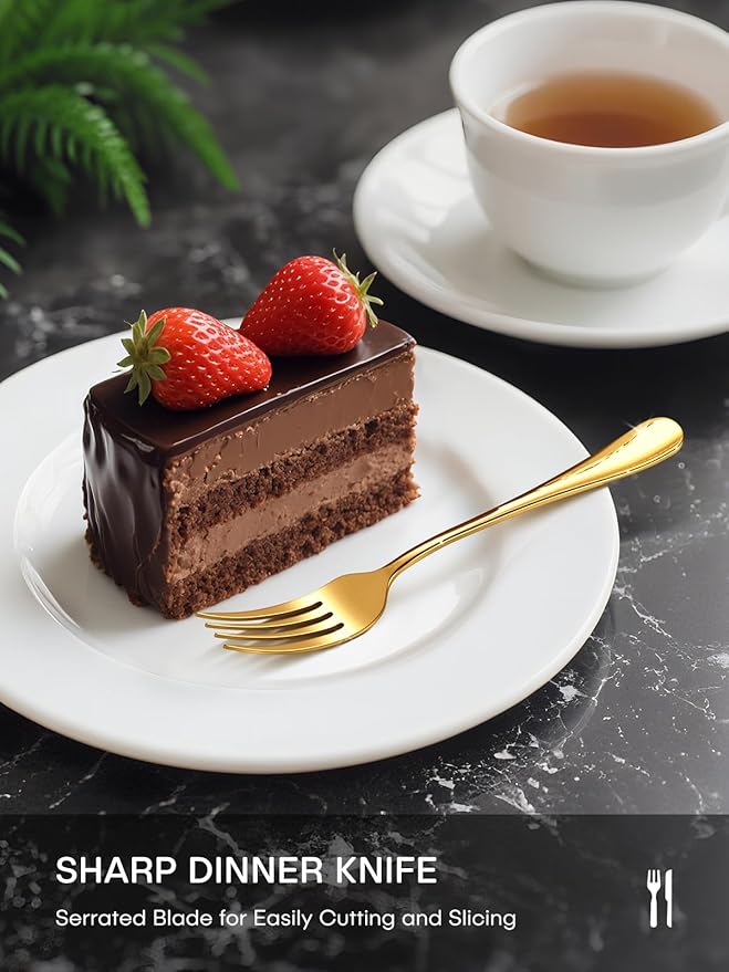 - Unique and Comfortable: The all-in-one molding technique of utensils has a seamless surface, which is less likely to accumulate food and ensures ultra-easy cleaning. Plus, each metal gold flatware set is ergonomically designed for perfect grip