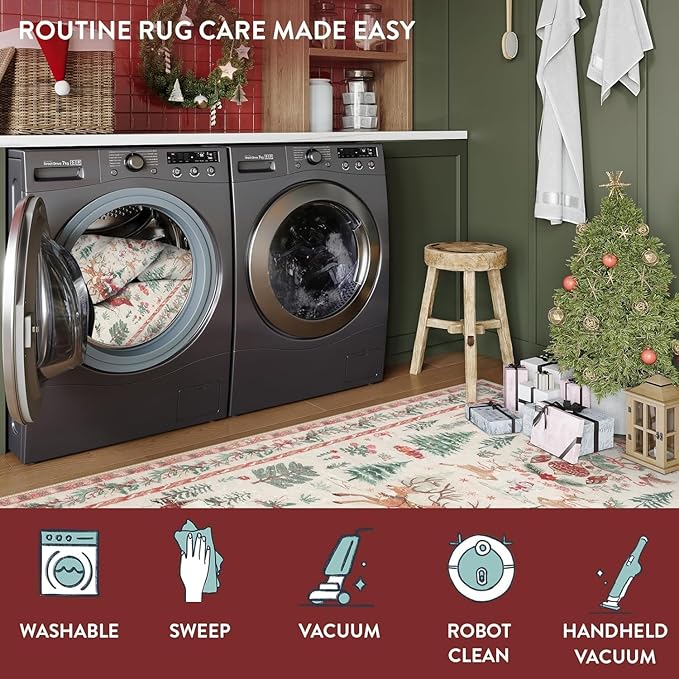 - [Hassle-Free Holiday Wash] - Clean holiday messes in minutes! Simply toss this Christmas rug in the washing machine (cold gentle cycle, no bleach). It resists fading, shrinking & odors, drying quickly to keep your entryway fresh for all your festive gatherings.