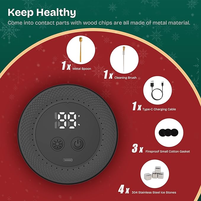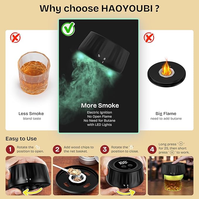- Safe and No Need to Use Butane:Adopting integrated electric design, paired with 3 fire-resistant cotton washers, it provides double protection for user safety. Even if you are not suitable for using open flames, you can still safely make smoked drink for family and friends.