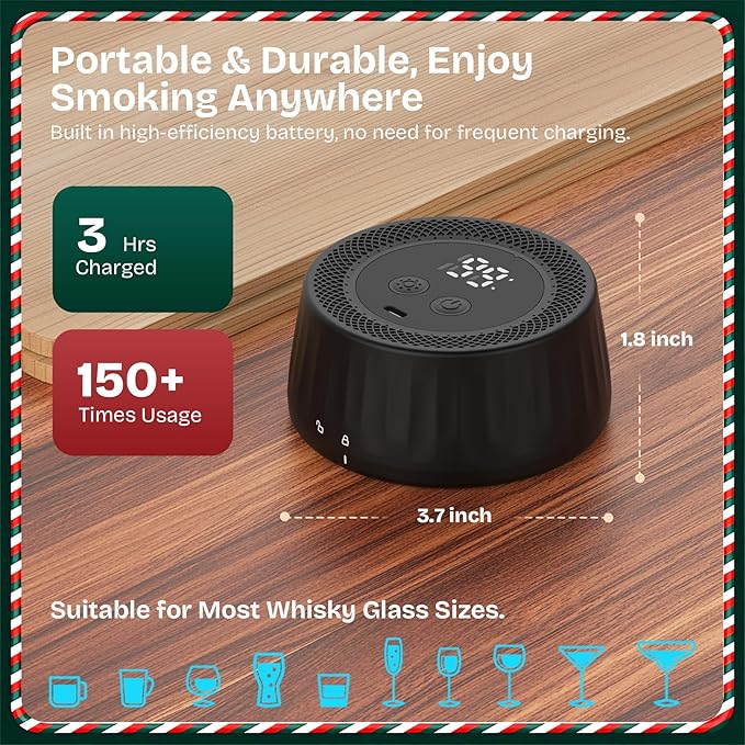 - Versatile and Durable, Easy to Use:Suitable for most whisky glass sizes. Built in high-efficiency battery, capable of completing 150+ ignitions when fully charged. Press the power button for 2 sec, then press it again to start working.