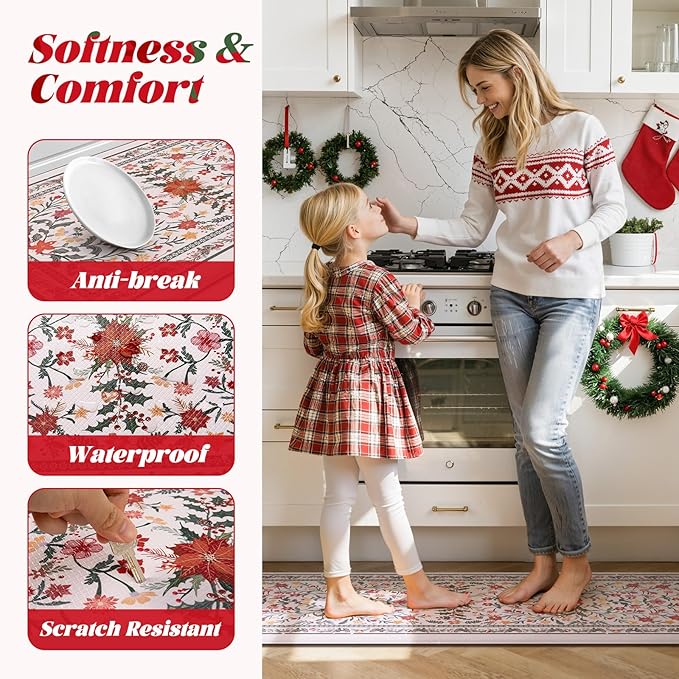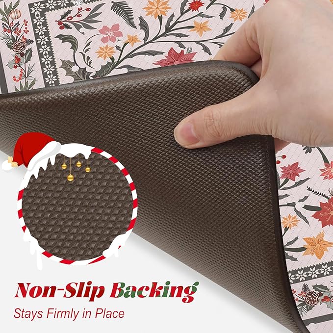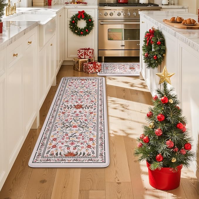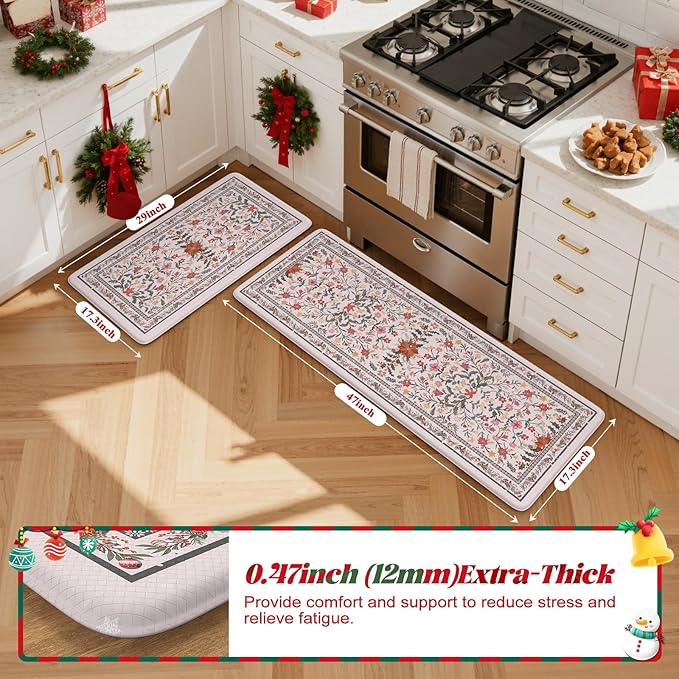 Collive Christmas Kitchen Mats for Floor, Cushioned Anti Fatigue Mat Non Slip Waterproof Kitchen Sink Rugs Sets of 2, Xmas Pink Floral Comfort Standing Desk Rug for Home, Laundry, 17"x29"+17"x47"