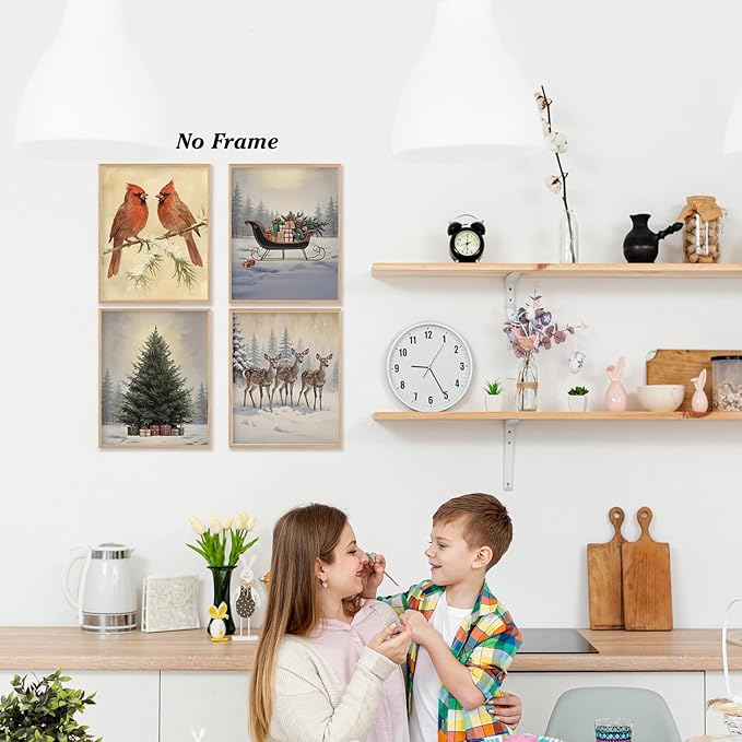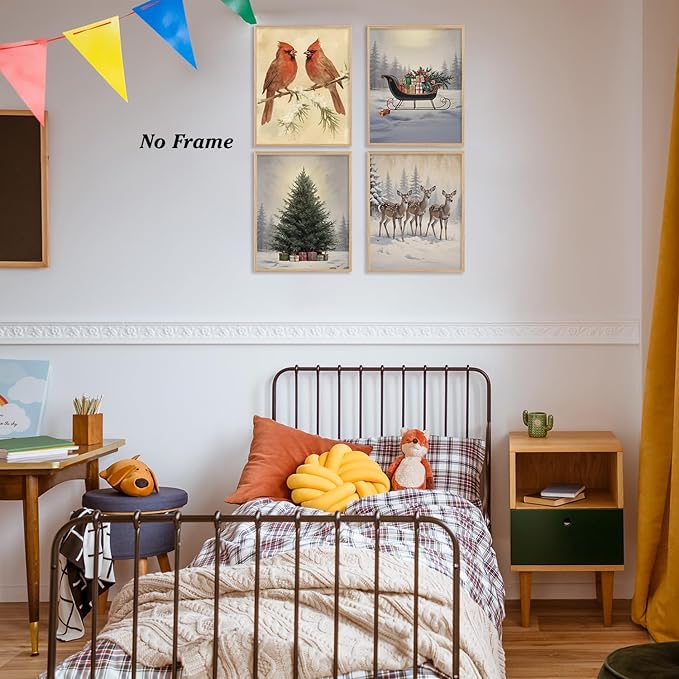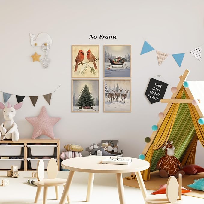 Boat Wades Winter Christmas Wall Art Prints Set of 4,Vintage Xmas Tree Red Cardinals Sleigh Reindeer Posters Pictures Wall Decor for Bedroom Living Room Home Office,Christmas Home Decor, 8x10 Unframed